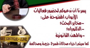 ينظم النادي القانوني التابع لجامعة ابي بكر بلقايد بتلمسان فعاليات الابواب المفتوحة على مخابر البحث ,الدكتوراه , المهن القانونية كما سيتم محاكاة لمسرح الجريمة و محاكمة و هذا يوم غد 01-06-2016 على الساعة( 9 ) التاسعة صباحا بالمكتبة المركزية الامامة ...