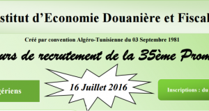ينظم معهد الاقتصاد الجمركي و الجبائي الذي اسس بموجب اتفاقية جزائرية تونسية بتاريخ 03-09-1981 مسابقة (مناظرة) توظيف (انتداب) الدفعة 35 بتاريخ 16-07-2016 حيث يقترح المعهد تكوين من الدرجة الثالثة لمدة سنتين ثم يوجه المتخرجون لمناصب عملهم حسب احتياجات وزارة المالية لمن يهمه امر ...