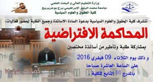 ستقيم جامعة البشير الابراهيمي كلية الحقوق و العلوم السياسية “برج بوعريريج” لاول مرة محاكمة الافتراضية بمشاركة الطلبة و بتاطير من اساتذة مختصين و هذا يوم الثلاثاء 09/02/2016 بالمدرج 01 التابع للكلية و تتشرف الكلية بدعوة السادة الاساتذة و جميع ...