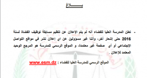 اعلنت المدرسة العليا للقضاء انه لم يتم اعلان عن تنظيم مسابقة توظيف القضاة لسنة2016 نزودكم بالبلاغ الخاص بالمدرسة العليا لمن يهمه امر تحميله: بلاغ يخص مسابقةالمدرسة العليا للقضاء 2016 (1) الموقع الرسمي للمدرسة العليا للقضاء